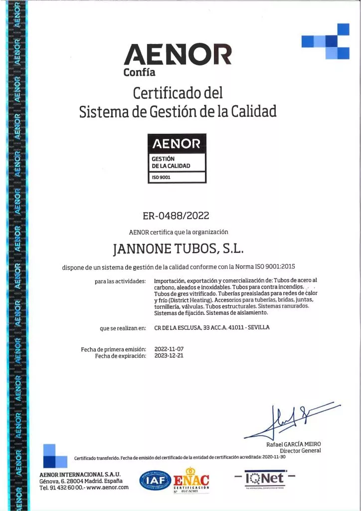 La organización de Jannone Tubos SL ha sido certificada por AENOR y dispone de un sistema de gestión de la calidad conforme con la Norma IS0 9001:2015